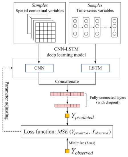 The calibration of the CNN-LSTM model includes a number of iteration steps for decreasing the error between the predicted values and observed values and adjusting the learnable parameters, such as the weights and biases in the network (Figure 5). The algorithm of back-propagation was applied in the calibration process to adjust the parameters of the network to minimize the overall loss [35]. Because the complex structure of the CNN-LSTM model could increase the risk of over-fitting, we used dropout layers to reduce this negative effect [17,44]. An activation function of ReLU was adopted to implement the nonlinear transformation of the neurons in the network for rapid converging [34].
