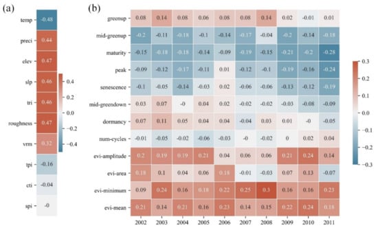 Correlations of soil organic carbon (SOC) content in the year of 2011 with environmental variables in the study area. (a) Correlations with climatic and topographic variables; (b) correlations with historical phenological and vegetation index variables from 2002 to 2011. The meanings of the abbreviations of all variables can be found in Table 1.