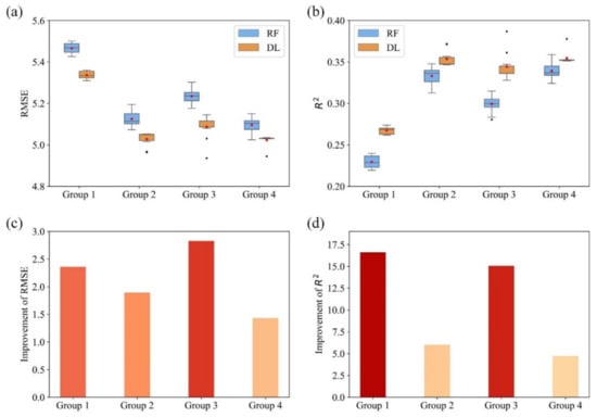 Accuracy and accuracy improvement in terms of RMSE (a,c) and R2 (b,d) for predicting SOC using the four groups of covariates with the deep learning (DL) and random forest (RF) models. Note: For the DL models, the CNN model was adopted for the first group, and the CNN-LSTM model was adopted for other three groups.