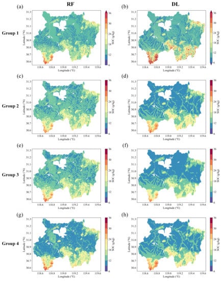 The predicted maps of soil organic carbon content (SOC) based on the deep learning (DL) (a,c,e,g) and random forest (RF) (b,d,f,h) models (shown in two columns) with four groups of covariates (shown in four rows).