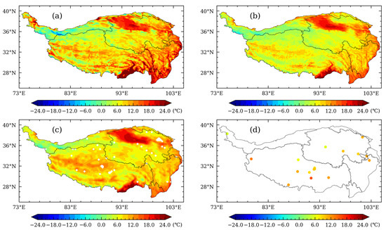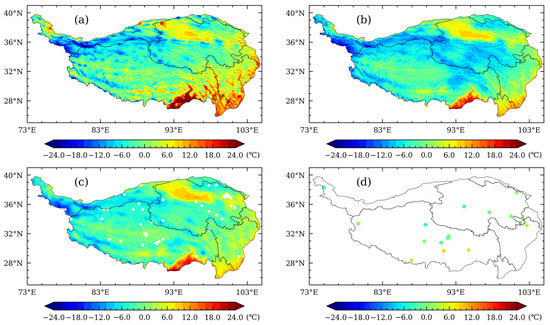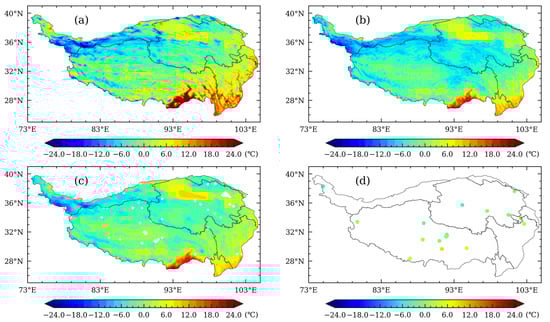 The Qinghai–Tibet Plateau (QTP) is regarded as the Earth’s “Third Pole” and “Asian Water Tower” [1,2]. It is the highest plateau in the world with an average elevation of over 4000 m. The strong dynamic and thermodynamic effects [3] of the QTP significantly affect atmospheric circulations in the northern hemisphere, as well as the Asian monsoon process and the climate patterns in East Asia [4,5], and have extremely important impacts on global climate change [1,2,3,4,5,6,7,8,9,10,11,12,13,14]. Glaciers, frozen soil, meadows, snow, and wetlands are widely distributed in the alpine region of the plateau, where the headwaters of China’s major rivers are located. The alpine region of the plateau is an important area of ecological barrier, but it is also an area of harsh climatic conditions [6] and fragile ecological environments [9] with low levels of economic development [5]. Climate change in the QTP and the various impacts it brings have become a frontier and hotspot in earth system science research, which has attracted extensive attention within the scientific community [1,2,14]. Surface air temperature is a key variable in the land-surface–atmosphere interaction and energy exchange, as well as in water cycle processes. It is also an important basis [7,8] for the studies of glacial melting, soil freeze-thaw and desertification, and ecosystems and climate change in the plateau. Due to the vast area of the QTP, the restrictions of transport, and the terrain environment, weather stations are only sparsely distributed in the QTP and mainly concentrated in the eastern and southern parts of the QTP [15]; few stations are located in the western and northern parts of the plateau [16]. To complicate matters furthers, many stations in the QTP are established late and with short sequences of observations, which makes the temperature observations unable to fully reflect the state of the surface air temperature over the entire plateau. Therefore, reanalysis products of temperatures with spatiotemporal continuity and broad applicability are required to provide critical data support [15,16,17,18,19] for climate change and impact studies over the QTP [20,21].