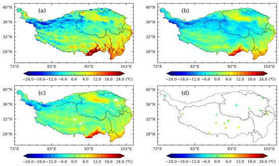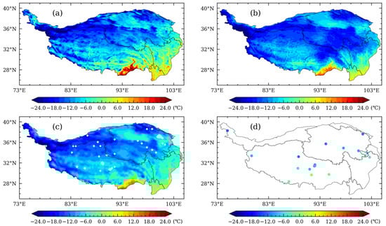 Spatial distributions of winter mean temperature over 2017–2018 ((a) CLDAS; (b) ERA5L; (c) GLDAS; (d) in-situ observations).