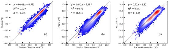 Scatter plots of reanalysis datasets versus in-situ observations ((a) CLDAS; (b) ERA5L; (c) GLDAS; n: total number of samples).