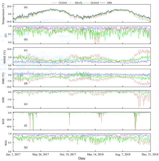Daily evaluation of during 2017–2018. (a) Time series of daily mean temperature; (b) CC; (c) RMSE; (d) MBE; (e) NSE; (f) KGE; (g) WIA.