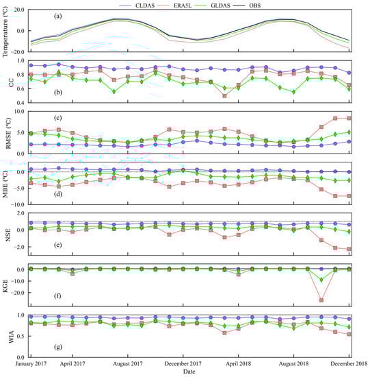 Monthly evaluation of during 2017–2018. (a): Series of monthly mean temperature; (b) CC; (c) RMSE; (d) MBE; (e) NSE; (f) NSE; (g) WIA.