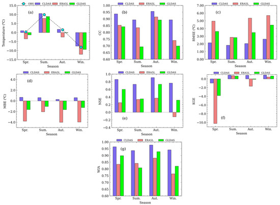 Seasonal evaluation during 2017–2018. (a): Seasonal changes of the average temperature; (b): CC; (c): RMSE; (d): MBE; (e): NSE; (f): KGE; (g): WIA.