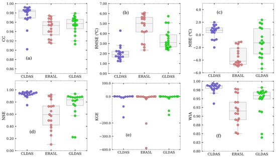 Figure 11 shows box plots of temperature errors of CLDAS, GLDAS, and ERA5L during 2017–2018. The numbers of stations with CC (Figure 11a) higher than 0.95 account for 82.4%, 52.9%, and 70.6% of the total number of stations for CLDAS, ERA5L, and GLDAS, respectively. The lowest CCs, with respective values of 0.902, 0.915, and 0.913 for CLDAS, ERA5L, and GLDAS, all occur at Ruoergai (Elinghu), while the highest CCs occur at Ali and Golmud (0.992 for CLDAS), Haibei (0.974 for ERA5L), and Mushitage (0.979 for GLDAS). RMSEs (Figure 11b) are within the ranges of 1.222–4.289 °C, 2.345–6.076 °C, and 2.366–5.736 °C for CLDAS, ERA5L, and GLDAS, respectively. The largest RMSEs of CLDAS and ERA5L occur at Ruoergai (Elinghu), where the correlation is the lowest. The largest RMSE of GLDAS is found at Lasa. The smallest RMSEs of the three datasets occur at different sites. The box plot of MBE (Figure 11c) shows that CLDAS is lower than observations at only 4 sites, i.e., Ruoerai (Elinghu), Sanjinagyuan, Golmud, and Shenzha, which account for 23.5% of the total observation sites. The largest negative bias (−1.995) is found at Ruoergai (Elinghu), and the largest positive bias (1.99 °C) occurs at Naqu (Hanhansuo). ERA5L data are lower than observations at all sites, and the largest bias is found at Mushitage (−4.968 °C). Positive biases of GLDAS only occur at Ruoergai (Maqu), Naqu (Qingzangsuo), Naqu (Hanhansuo), and Shuanghu, which account for 29.4% of the total stations. The largest positive bias occurs at Shuanghu (2.37 °C); the biases of GLDAS are negative at all other sites with the largest negative bias (−5.385 °C) at Lasa. The consistency indices of NSE for CLDAS, ERA5L, and GLDAS (Figure 11d) are within the ranges of 0.748–0.974, 0.102–0.919, and 0.219–0.934, respectively, and the ranges of KGE (Figure 11e) are −157.108–0.918, −389.193–0.537, and −138.881–0.882, respectively. The ranges of WIA (Figure 11f) are 0.936–0.994, 0.85–0.978, and 0.839–0.982, respectively. Based on NSE, KGE, and WIA, the consistency of CLDAS is the worst at Ruoergai (Elinghu) and the consistency of GLDAS is the worst at Lasa. The consistency of ERA5L is worst at Zhufeng, Zangdongnan, and Lasa. In summary, the various reanalysis datasets show different qualities and applicability.
