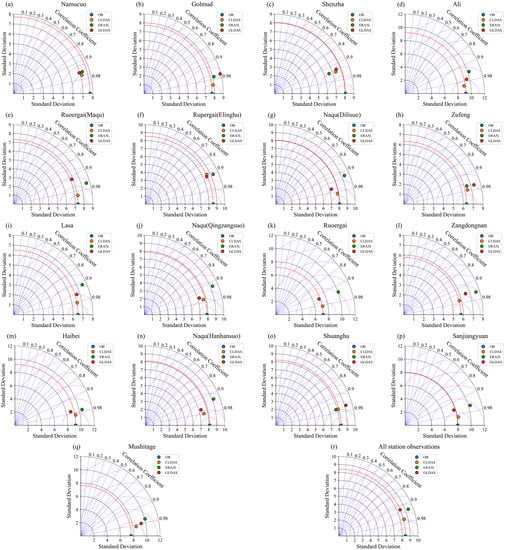 Taylor diagrams of (a–q) CLDAS, ERA5L, GLDAS against in-situ observations at 17 stations and (r) all observation stations.
