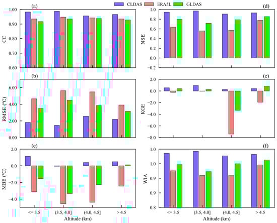 To explore the temperature variation characteristics of the three reanalysis datasets in different elevations, the observation sites are divided into four categories of elevation: <3500 m, ≥3500–4000 m, ≥4000–4500 m, and ≥4500 m. Figure 13 show the bias characteristics of the three gridded datasets at different elevations. In terms of evaluation indices (CC, NSE, KGE, and WIA), the consistency between CLDAS and the in-station observations is higher than the other analysis products at any altitude. The MBEs of CLDAS show a positive deviation relative to the observation station, while ERA5L and GLDAS are opposite. The RMSEs of CLDAS are lower than those of the other two reanalysis datasets, and GLDAS is better than ERA5L. Although the CCs of ERA5L is slightly higher than GLDAS, other indices (NSE, KGE and WIA) are relatively lower than GLDAS. Compared to ERA5L and GLDAS, the CLDAS temperature data is less affected by elevation.