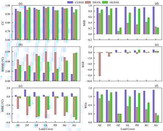 The errors at different land covers: (a) CC; (b) RMSE; (c) MBE; (d) NSE; (e) KGE; (f) WIA.