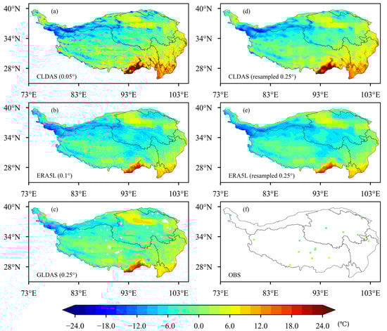 Spatial distributions of annual mean temperature over 2017–2018. (a) CLDAS (0.05°); (b) ERA5L (0.1°); (c) CLDAS (0.25°); (d) CLDAS (resampled to 0.25°); (e) ERA5L (resampled to 0.25°); (f) OBS (in-situ observations).