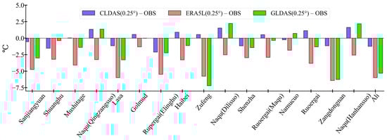 To explore the temperature variation characteristics and accuracy of the three reanalysis datasets at the same resolution, GLDAS and ERA5L are resampled to GLDAS grids with the spatial resolution of 0.25° using the mean value algorithm [55], and thus the three reanalysis datasets have uniform temporal and spatial resolutions. Figure 15 show the spatial distributions of annual mean temperature over 2017–2018. Although remapping CLDAS and ERA5L reduces the resolution, it still shows more advantages in detail than GLDAS. Figure 16 shows the bias of annual mean temperature between in-situ observations and reanalysis datasets at 17 weather stations. It is easy to find that, at each observation station, CLDAS has a small deviation to in-situ observations compared with ERA5L and GLDAS.