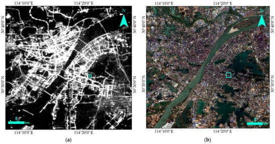 Located in Wuhan, China, Guangbutun region is a typical representative of Wuhan’s economic growth dynamics, and it was chosen as the target region for monitoring and analyzing night-time light pollution in this study. To the west of Guanbutun is the bustling Jiedaokou commercial district, while the north–south location is adjacent to Wuhan University and Central China Normal University, and the east side of Guangba Road is flanked by a large number of shops and residential areas. The SQM device is situated on the roof of the State Key Laboratory of Information Engineering in Surveying, Mapping, and Remote Sensing (lat = 30.528°N, long = 114.354°E, h = 40 m above mean sea level) at Wuhan University, which provides the convenience of setting up and maintaining the device due to the open campus environment. Locations and surrounding NTL sources are shown in Figure 1. Figure 1a illustrates the NTL image of Wuhan by Luojia-1 satellite, which was launched on 2 June 2018 [29]. Because of its high spatial resolution of 130 m, Luojia-1 can provide rich information in urban areas and has great potential for artificial light pollution investigation [30]. In addition, Figure 2 indicates the complete night-time sky and the NTL sources from the Jiedaokou commercial district, which is the major contributor to the night-time skyglow at night. Since we were unable to access the SQM observation site during the lockdown, all images in Figure 2 were taken after the lockdown was lifted, and they are only for exhibition purposes.