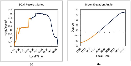 (a): The SQM records series obtained between 17:56 18 November and 6:20 November 2019; (b): The generated moon elevation angle (−90°~90°) series for the SQM records series. Only the SQM records acquired before 22:34 were retained (the orange part) to remove the impact of the moon.