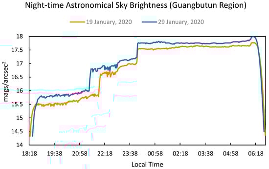 The night-time sky brightness series of Guangbutun region obtained with the SQM device. Note that 19 January 2020 is prior to the COVID-19 lockdown and 29 January 2020 is during the lockdown.
