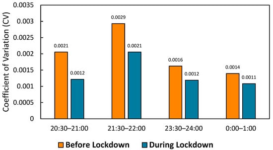 Average coefficients of variation (CV) at four typical time intervals before and during the COVID-19 lockdown.