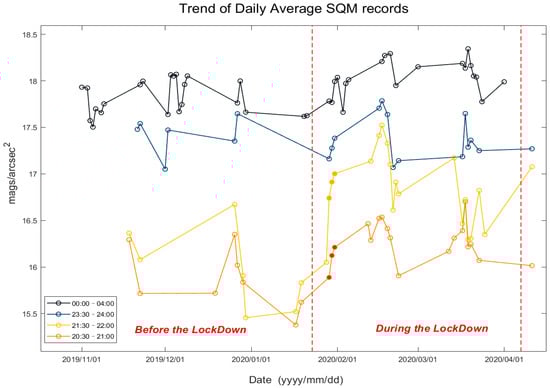From 1 November 2019 to 12 April 2020, the trend of daily mean SQM measurements at various time intervals. Some of the data influenced by the moon is displayed here and solidly marked, which was not used in further quantitative analysis.