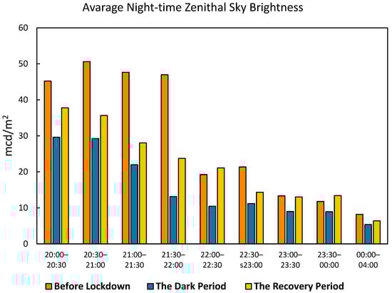 Furthermore, the recovery of night-time urban skyglow also varied at different time intervals during the recovery period. The best recovery was near midnight, when the RRs exceeded 30%. For example, the average ZSB between 23:30–24:00 entirely recovered later in the lockdown (13.4 mcd/m2, compared to 11.8 mcd/m2 before the lockdown). During the hours of 23:00–23:30, the average ZSB also basically rebounded to the pre-lockdown level (13.0 mcd/m2, compared to 13.3 mcd/m2 prior to the lockdown). The recovery of sky brightness was somewhat poorer after midnight, reaching only 78% of the original level (RR = 12.4%), as was the case from 20:00–21:00, reaching 84% and 70% (RR = 18.1% and 12.6%), respectively. The worst recovery period also occurred at the 21:30–22:00 time interval, with a rebound to only 51% of the previous level (23.7 mcd/m2, compared to 44.0 mcd/m2 before the lockdown). However, we perceived its potential for rapid restoration because the RR at the 21:30–22:00 time interval was over 20%.