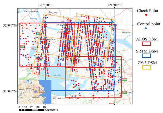 The distribution of the ZY-3, ALOS and SRTM DSMs (with the location of the elevation control and check points).