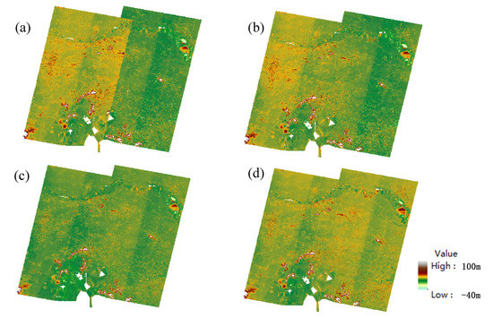 Comparison of ZY-3 DSMs before and after block adjustment in object and image space. (a) Original DSMs, (b) uncontrolled DSM block adjustment, (c) uncontrolled image block adjustment, and (d) controlled DSM block adjustment.