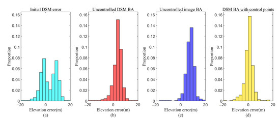 Histograms of check point elevation error for the ZY-3 DSMs. (a) before block adjustment, (b) uncontrolled DSM block adjustment, (c) uncontrolled images block adjustment, and (d) controlled DSM block adjustment.