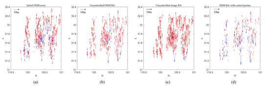 Elevation error distribution on check points for the ZY-3 DSMs (positive errors are indicated by the up-pointing red arrows and negative errors by down-pointing blue arrows). (a) before block adjustment, (b) uncontrolled DSM block adjustment, (c) uncontrolled images block adjustment. (d) controlled block adjustment.