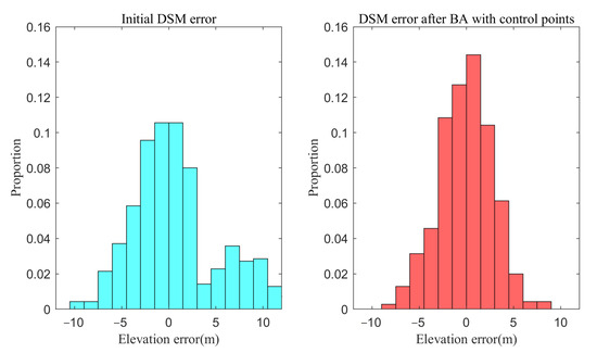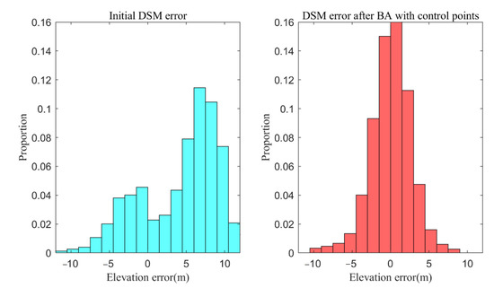 First, to intuitively compare the results between the block adjustment performed on the image space and the method directly conducted on DSMs proposed in this paper, corresponding DSMs are generated from the refined images by stereo mapping after the RFM-based image block adjustment [8,9,23,24]. The elevation check points are utilized to evaluate the elevation accuracy of DSMs generated by the two methods.
