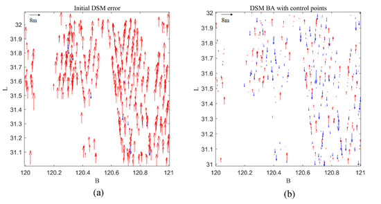 Elevation error distribution on the check points for the SRTM DSMs (positive errors are indicated by the up-pointing red arrows and negative errors by down-pointing blue arrows). (a) before block adjustment, and (b) after block adjustment.