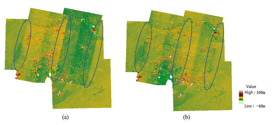 DSM comparison before and after the block adjustment for the ALOS and ZY-3 DSMs with the ellipses indicating the areas of significant difference. (a) Before block adjustment, and (b) after block adjustment.