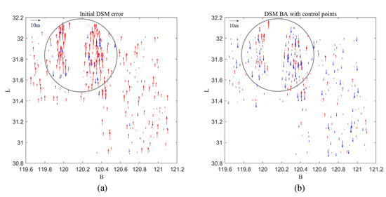 Elevation error distribution on the check points for the ALOS DSMs (positive errors are indicated by the up-pointing red arrows and negative errors by down-pointing blue arrows), the ellipse indicates the area of significant difference. (a) before block adjustment, and (b) after block adjustment.