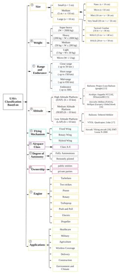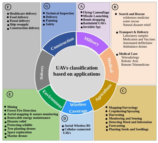 According to Figure 1, box J, UAVs can be classified based on their applications. Figure 2 presents several applications in which UAVs are employed that can be used for classification, as detailed below.