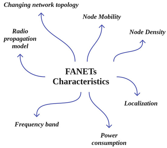 As shown in Figure 3, the main characteristics of FANETs are node density, node mobility, changing network topology, communication range, radio propagation model, localization, power consumption, frequency band, cost efficiency, versatility, agility, and network lifetime [65,66,67,68], as detailed below.