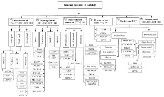 - Delay-tolerant networks (DTNs) (Figure 5, box C): In DTNs, the mobile nodes are intermittently and unstably connected. As the mobile nodes experience high latency and low data rates, new routing protocols are needed to address the DTN characteristics [66]. The three main DTN-based routing protocols studied for FANETs are deterministic, social network, and stochastic [66], which are depicted in Figure 5, box C.