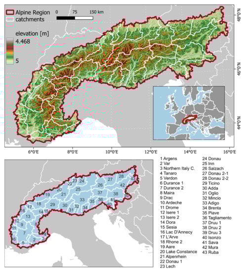 SLE time series were derived for all hydrological catchments within the Alpine region as defined by the Alpine Convention [31] (Figure 2). Within this area, 43 catchments were analyzed. Small parts of larger catchments that intersect with the perimeter were excluded from the analysis. The catchments of the rivers Danube and Drava (Druu) were split into two and three sub-catchments, respectively, since they are covered by multiple satellite acquisition tracks.