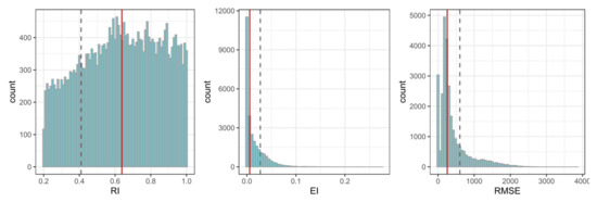 Representative Index (RI), Error Index (EI), and Root Mean Square Error (RMSE) of all derived SLE observations. The red vertical line marks the median value, the dashed line the 20th (RI) and 80th (EI, RMSE) percentiles, respectively. RImedian = 0.64, RI20th = 0.41, EImedian = 0.006, EI80th = 0.027, RMSEmedian = 255, RMSE80th = 605.