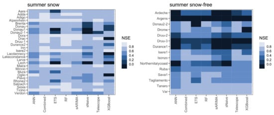 Figure 7 shows the performance of each forecasting method as measured by the NSE in each catchment where the SLE is not maxed out (left) and those where it is (right). A high NSE score throughout is achieved by Telescope, RF, and the Combined forecast in catchments where the SLE is not maxed out. Here, also sARIMA and ANN performed satisfactorily. ETS, sNaive, and XGBoost, in contrast, performed especially weakly in a few catchments where the mean of the observations would be a better forecast (NSE < 0). The overall forecast performance is lower in catchments with a maxed-out SLE. Here, no method achieves an NSE > 0.8 in any catchment, and for Argens and the lower Druu catchment, the NSE is below zero for most of the forecasting approaches. In snow-free catchments, the forecast quality apparently depends on the input data rather than on the selected method. However, RF, Telescope, and the Combined forecast appear to be somewhat robust to difficult time series patterns.