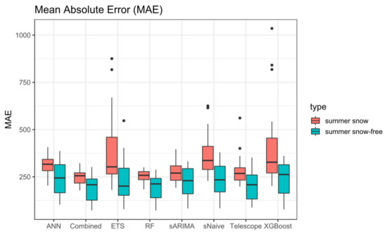 The MAE was used to quantify how accurately the SLE is forecast by each evaluated method in each catchment (Figure 9). For catchments in which the SLE does not max out in the summer months, in most of the cases, an MAE between 200 and 400 m is achieved, with outliers in both directions. Here, the Combined Forecast (median MAE: 256 m), RF (258), Telescope (268), and sARIMA (270) perform best on average (Figure 10). In particular, ETS and XGBoost have greater outliers in single catchments and are less reliable. The best forecast overall is achieved by the Combined forecast with an MAE of 178 m in the Adda catchment. In contrast to the NSE, the forecast performance appears to be better in catchments with a maxed-out SLE when measured by the MAE. Here, 58% of all forecasts made achieve an MAE < 200 m. The best forecast is achieved by RF in Ardeche with an MAE of 72 m and there are no extreme outliers. In contrast to the catchments showing summer snow, in snow-free catchments, the forecast performance is more dependent on the input data than on the applied forecasting method. We attribute the better MAE performance to the fact that large SLE outliers that diverge from the forecast median occur less often in maxed-out catchments and are smaller in magnitude due to the less pronounced topography.