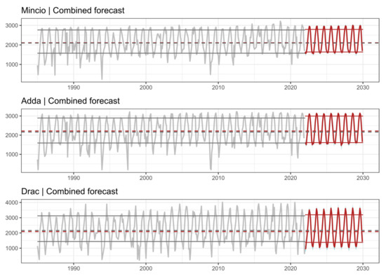 Observed (grey) and forecast (red) SLE time series for the catchments Mincio, Adda, and Drac. Dashed lines show the median values of the observed (grey) and forecast (red) time series; thin solid lines show the 20th and 80th percentile. While the median SLE is projected to increase in the coming years in Mincio (+16 m) and Adda (+55 m), a negative change is modeled for Drac (−74 m). See further discussion in Section 4.3. The forecasts were generated using the Combined forecasting scheme.