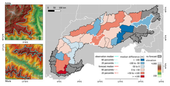 The difference between the medians of the observed and the forecast time series was further analyzed for all catchments in the Alps (Figure 14, Table A1). This metric gives an indication if the SLE is projected to retreat to higher (positive difference) or descent to lower elevations (negative difference). However, a positive long-term SLE trend does not necessarily result in a positive median SLE difference, as the example from Drac shows in Figure 13. 17 of the 28 catchments (61%) in which the forecast up to 2029 was conducted retained the sign of the long-term trend in the median difference. Possible reasons for that are further addressed in the discussion (Section 5.3). With the exception of Drac, catchments with a strong positive SLE trend (>6 m/y) also have a positive median difference, i.e., the median SLE is forecast to recede to higher elevations in the future. Furthermore, there are two clusters of catchments with a negative difference in medians while the long-term trend was positive. In the Eastern Alps, the catchments Upper Drava, Piave, and Brenta exhibit a weak long-term trend of ~+2 m/y. Similar to the example of Drac, the observed times series in these catchments exhibit frequent SLE outliers beyond the 20th and 80th percentile. The resulting forecast median and percentiles are well below the observations here. In the Western Alps L’Arve, Dora, Sesia, and Maira have stronger positive trends around +4 to +6 m/y, while the negative median shift is smaller than in the Eastern Alps. The details in Figure 13 show the location of the median, 20th, and 80th percentile of the forecast SLE in comparison to the long-term observations in the topography of the catchments Adda and Mura. In Adda, the shift of the 80th percentile is much stronger than that of the 20th percentile, indicating that the retreat of the SLE in summer is more pronounced than in winter. In Mura, in contrast, the median SLE is forecast to move to lower elevations in the coming years, while the winter SLE stays relatively stable.