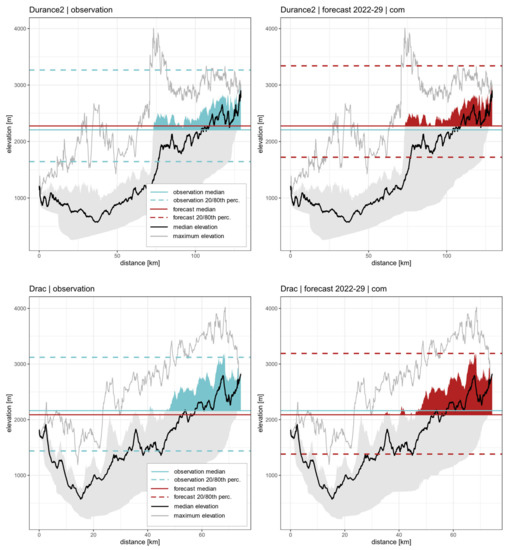 For example, the swath profile of the upper Durance catchment in the Western Alps shows that especially the eastern part of the catchment is directly affected by changing SLE dynamics, while in the west, more than 80% of the elevation lies below the 20th SLE percentile. The projected median shift of +69 m thus affects particularly the upper reaches of the catchment. Here, we highlighted the elevations that are covered in snow at least 50% of the time, i.e., the area above the SLE medians, which is projected to substantially reduce in the coming years. While in Durance, an overall shift of the SLE to higher elevations is forecast in all seasons, future seasonal SLE dynamics are more ambiguous in Drac. The negative median difference (−74 m) is accompanied by an increased level of the 80th percentile and a decrease in the 20th percentile of the SLE. Both percentile levels are associated with the SLE in the summer and winter seasons, respectively; therefore, in winter, the SLE is projected to reach lower elevations more often, while in summer, it will retreat to even higher elevations than before.