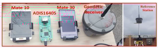 View of the experiment devices. Left: Huawei Mate 10, triaxial inertial sensor ADIS16405, Huawei Mate 30, and South geodetic receiver. Right: the reference station is placed in the open area on the roof.