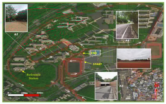 Dynamic trajectories of the whole experiments. The pictures named A1, A2, A3, and A4 show some realistic GNSS-degraded environments for each experiment, and the yellow box shows the location of the reference station. A denotes the area.