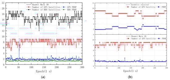 Number of GNSS satellites and PDOP values on the playground in area 1. (a) GPS and BDS measurements observed by Mate 30; (b) GPS measurements observed by the geodetic receiver and Mate 10.
