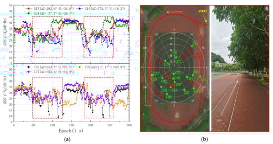 Carrier-to-noise power density ratio values of GNSS satellites observed by the Huawei Mate 30 on the playground. (a) Some GPS and BDS satellites whose signals are degraded due to the trees, and the red box shows the C/N0 value in the area marked by the yellow box in Figure 4b. (b) Left: reference trajectory and sky plot of GPS and BDS. Right: realistic environment marked by the yellow box.
