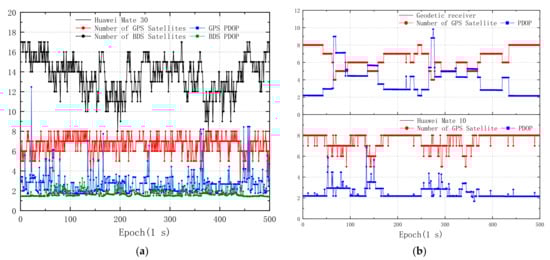 Number of GNSS satellites and PDOP values on the sidewalk in area 2. (a) GPS and BDS measurements observed by Mate 30; (b) GPS measurements observed by the geodetic receiver and Mate 10.