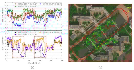 In Figure 4a, there are 9, 56, and 19 epochs for which the satellite signals of GPS pseudorandom noise (PRN) 17, PRN 19, and PRN 21 cannot be detected in 300 epochs, where the unlock rates are 3.00%, 18.67%, and 6.33%, respectively. The unlock rates of BDS PRN 05, PRN 09, and PRN 21 are 28.00%, 13.33%, and 5.00%, respectively. Both the C/N0 values of GPS and BDS decrease significantly around 50 epochs and 180 epochs. The average C/N0 value of GPS in the first 50 epochs is 33.01 dB-Hz, and the average C/N0 value in the second 50 epochs is 27.20 dB-Hz, which decreases by 17.60%. The average C/N0 value of BDS in the first 50 epochs is 32.25 dB-Hz, and the average C/N0 value in the second 50 epochs is 24.67 dB-Hz, which decreases by 23.50%. The maximum C/N0 values of GPS and BDS are 44 dB-Hz and 39 dB-Hz, while the minimum values are 11 dB-Hz and 9 dB-Hz, respectively.