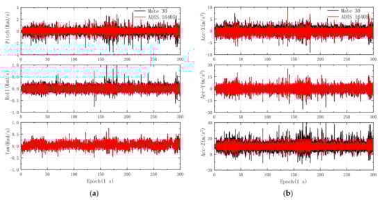 Comparisons of the IMU data from Mate 30 and ADIS16405. (a) Three-axis gyroscope; (b) three-axis accelerometer.
