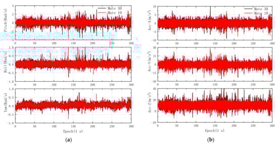 Comparisons of the IMU data from Mate 30 and Mate 10. (a) Three-axis gyroscope; (b) three-axis accelerometer.