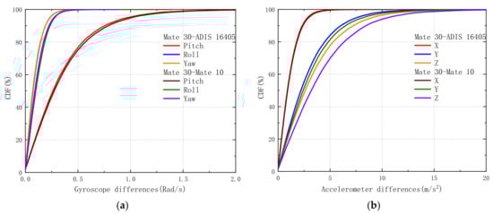 Comparison of cumulative distribution function (CDF) of three-axis gyroscope and accelerometer differences from Mate 30, ADIS16405, and Mate 10. (a) Three-axis gyroscope; (b) three-axis accelerometer. Mate 30–ADIS16405 denotes the CDF of gyroscope and accelerometer differences between Mate 30 and ADIS16405, and Mate 30–Mate 10 denotes the CDF of gyroscope and accelerometer differences between Mate 30 and Mate 10.
