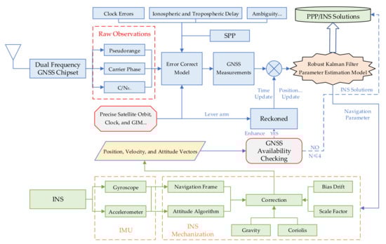 The flow chart of GNSS PPP/INS integrated navigation on smartphones.